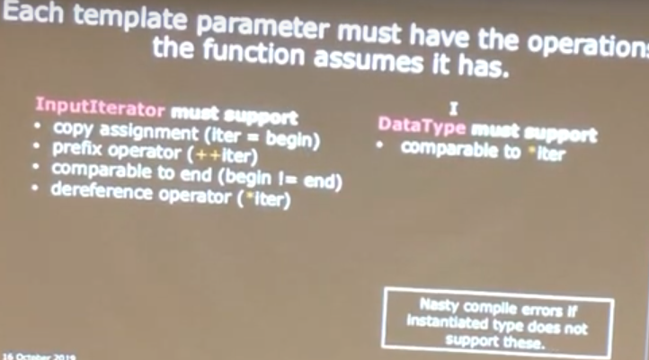 A template function defines an implicit interface that each template parameter must satisfy.