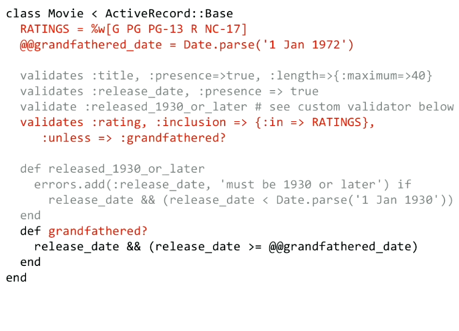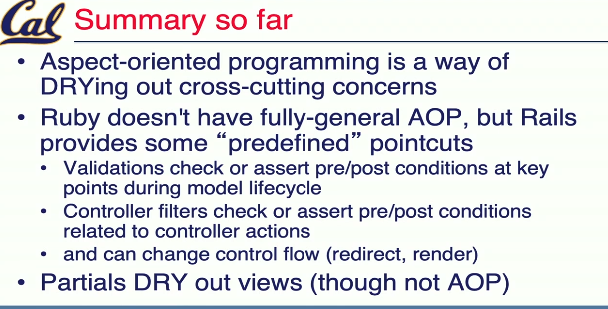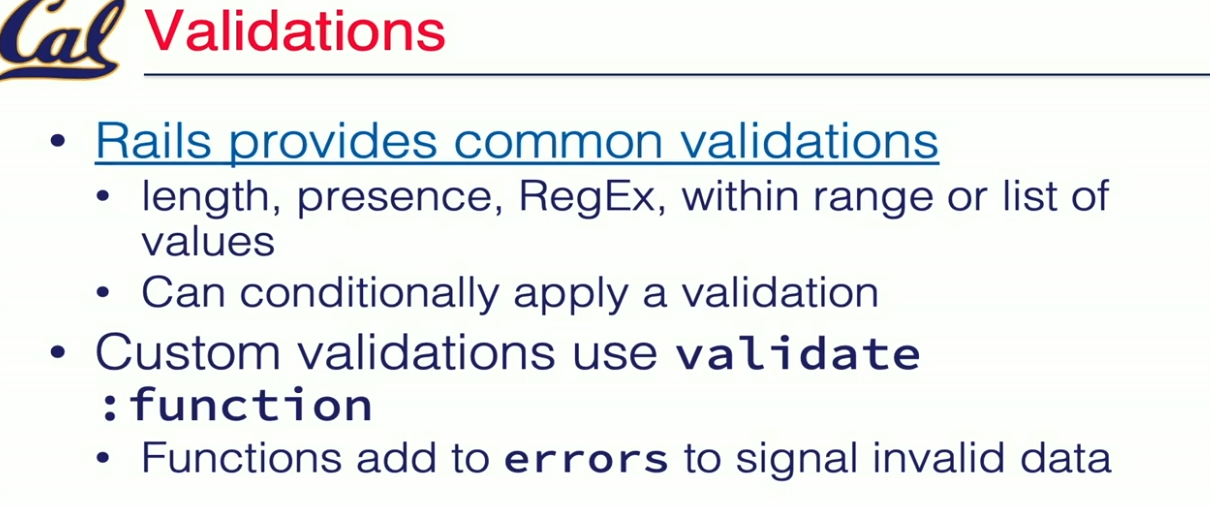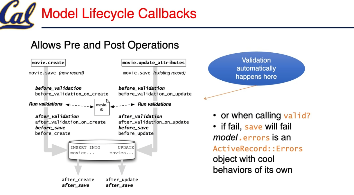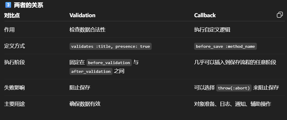 Validation is advice in AOP sense, specifying declaratively in model class. Rails 的验证(validation)是固定阶段自动运行的,而回调(callback)是我们可以在各个阶段插入自定义行为的钩子。