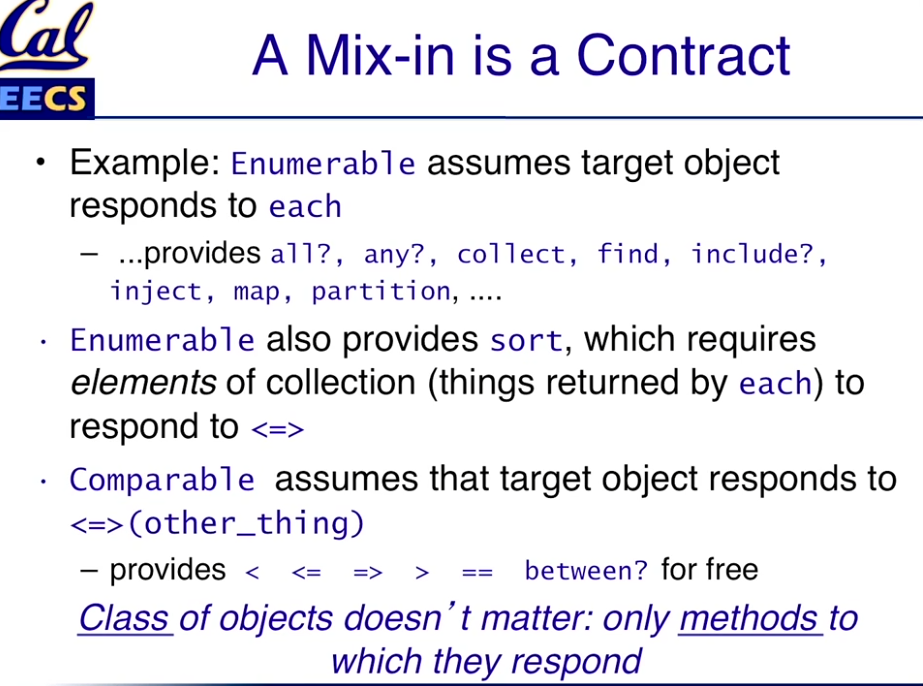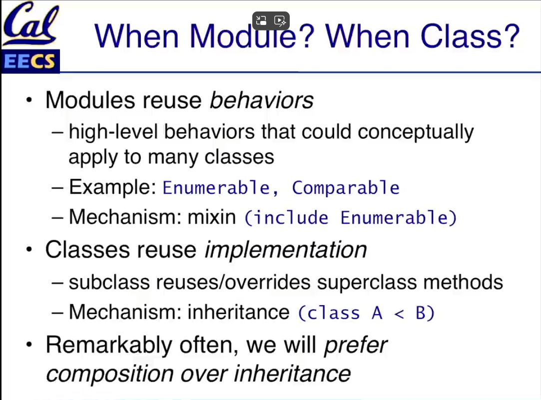 When you have behaviors you want to reuse, you can put them into a module. That module can be mixed into many classes as long as you make clear what does the module expect from the classes that you’re mixing it into.
