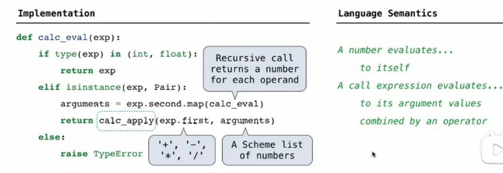 • Call: A call expression evaluates to its argument values(operands which is evaluated by another recursive call) combined by an operator.