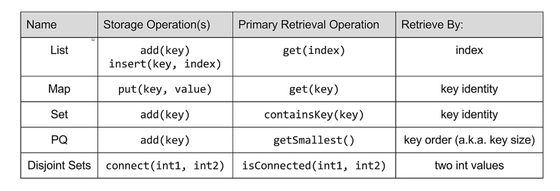 We should notice that there are three fundamental structures: map, set and list(queue, deque, stack, etc.).