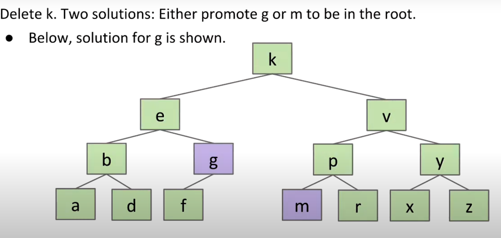 • Two child: Find its precursor or successor in in-order.(The biggest one in left child tree (has no right child) or smallest one in right child tree (has no left child))