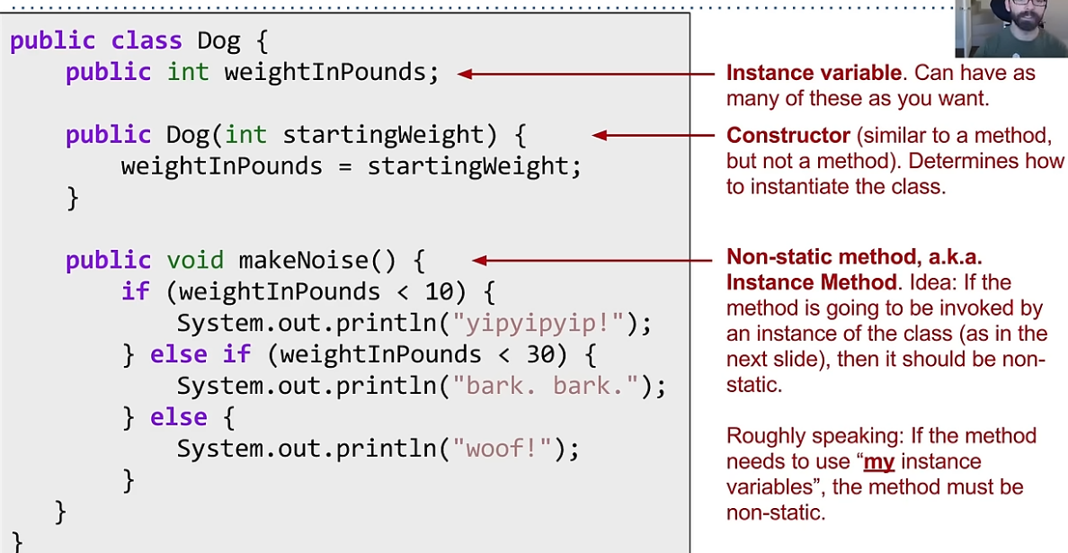 Dog.makeNoise() - Static methods must access instance variables via a specific instance, e.g. d1.
