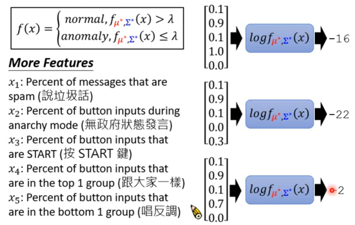 这个难以用二分类做到,因为我们有大量的正常资料;但是几乎没有多少异常资料,并且混杂在正常资料中, 人难以侦测,大多数时候也没有标注。并且异常可能有很多种,往往都是与正常数据不同的判定为异常,所以我们无法收集到所有类别的异常数据,更无法预测可能有什么样的异常。