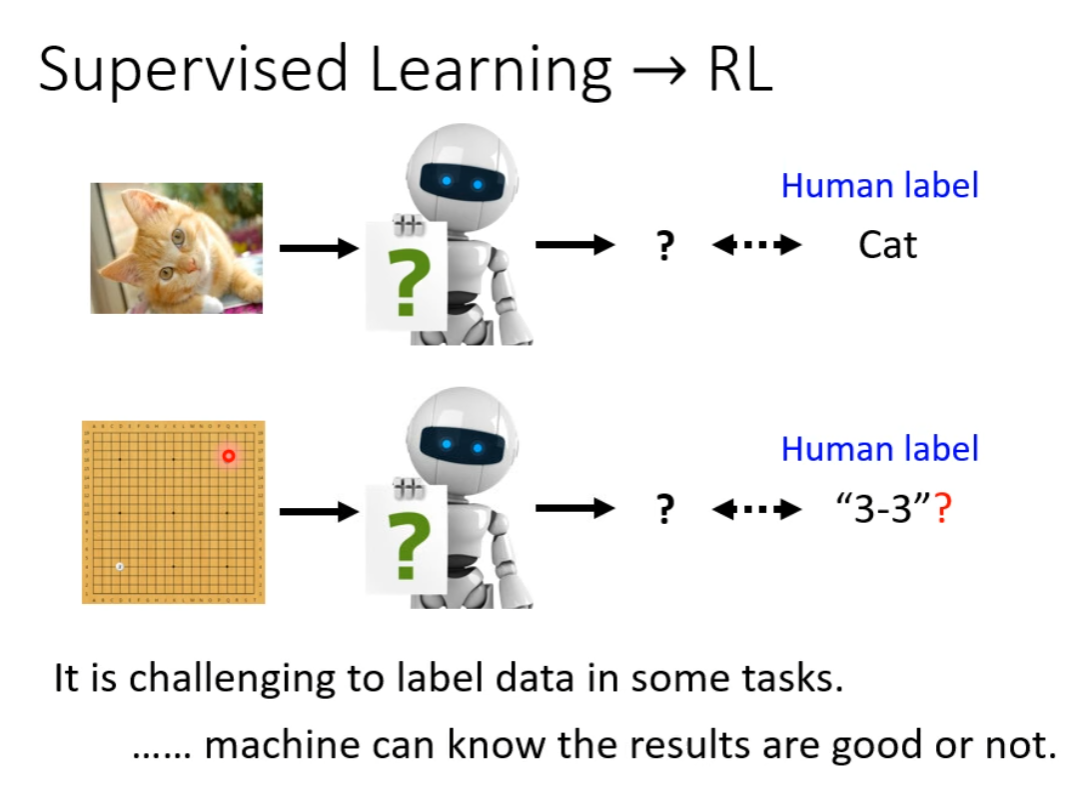 有时候,我们面对的问题无法 Label(也无法通过 Self-Supervised Learning 的方法让机器自己用输出的一部分作为 label)。也就是我们并不知道答案是什么,这时候我们需要用到 RL。