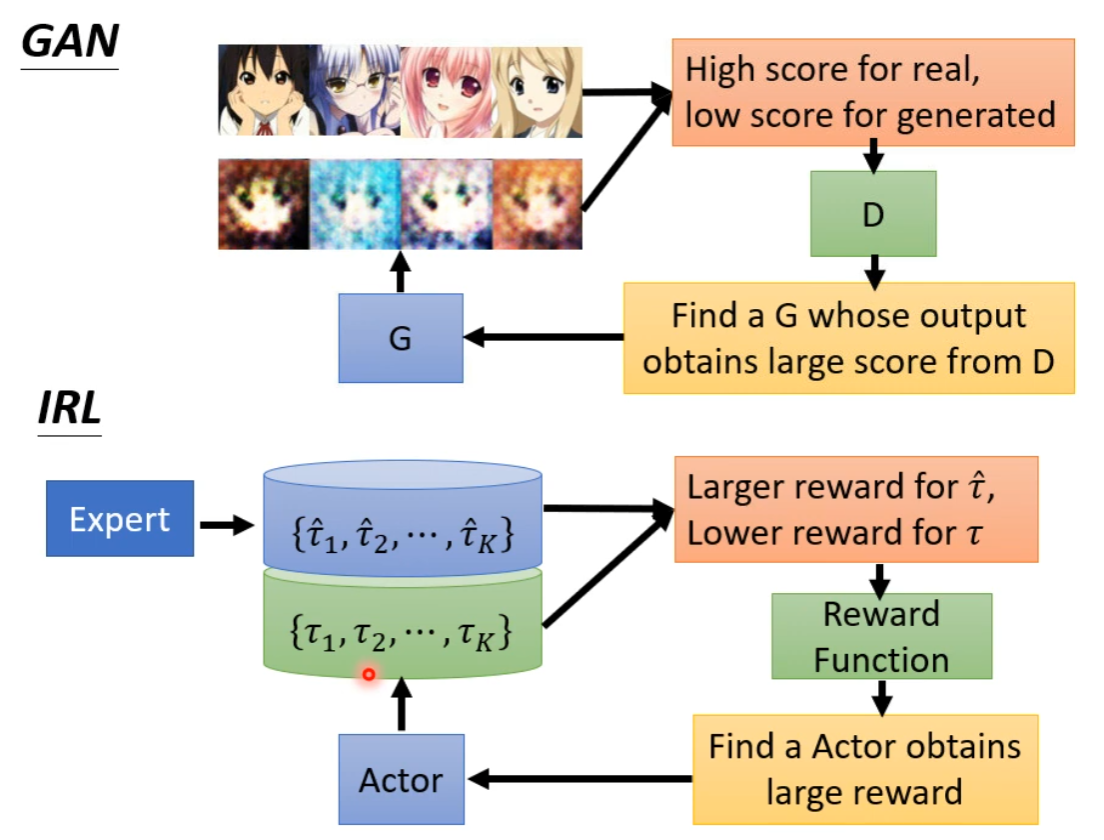 - 不同处:GAN 的 Discriminator 也是一个 Network,可以用 Gradient Descend 训练 Generator,使得 Discriminator 得到最大输出。而 RL 中,Environment 和 Reward 是黑盒子,不是真正的 Network,无法用 Gradient Descend 的方法来调整参数。