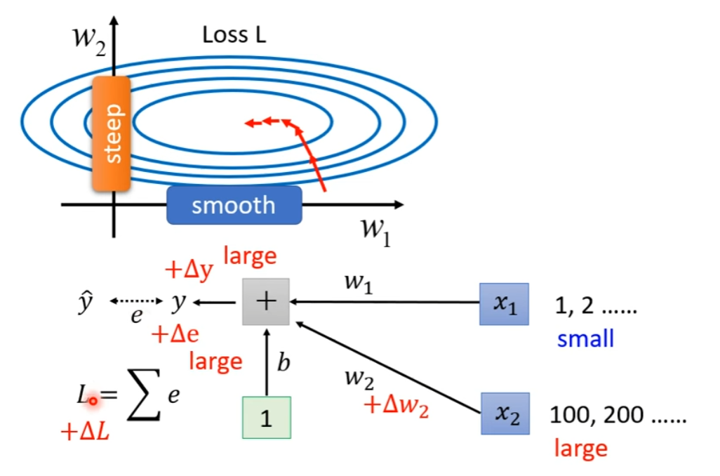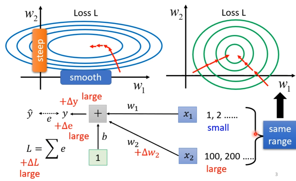 所以,我们可以让不同的 dimension 到一个类似的数值范围,就会有更好地 Error Surface