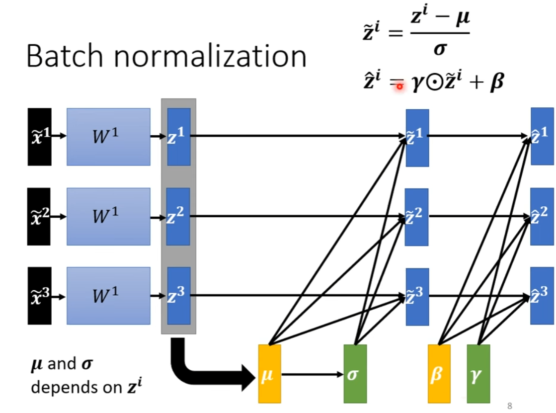 实际情况中,会再后面再进行一点变换,防止 normalization 抹除了维度间均值和大小的差异,降低网络表达能力。初始时, 为全 1 向量, 为全 0 向量,然后作为神经层的学习参数,自主学习修改。