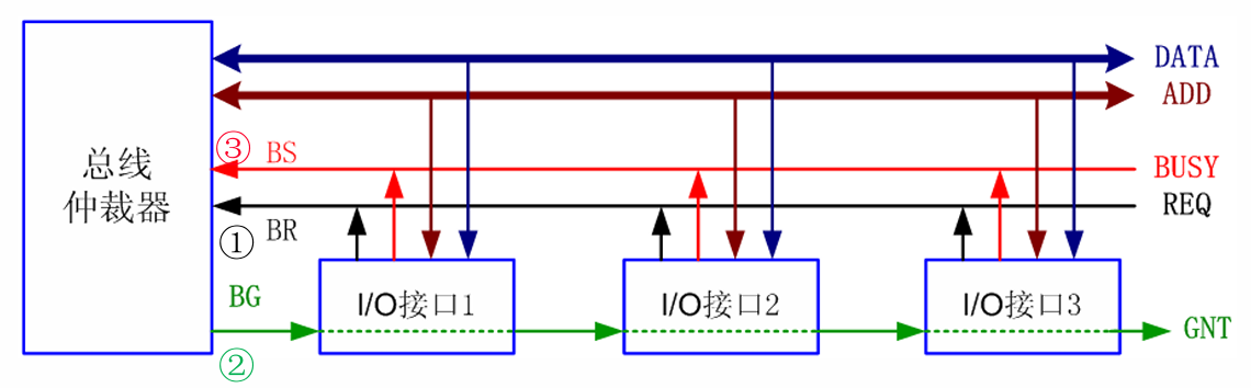- 总线仲裁器收到总线申请BR,将BG(总线同意信号)逐个往下传。