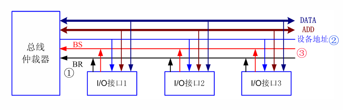- 接口向总线控制器(仲裁器)发出总线申请BR(总线申请信号)。