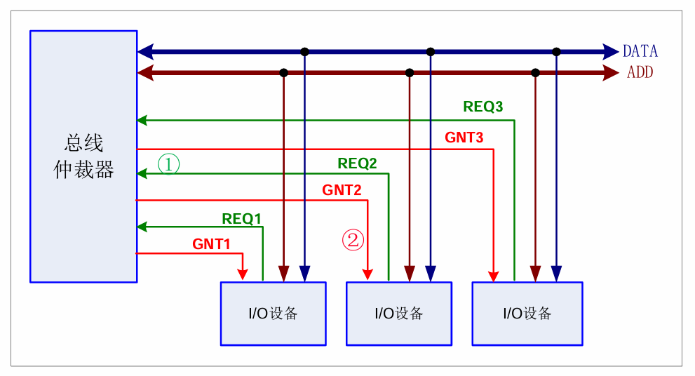 - 总线控制器根据设备的优先级决定将总线的使用权交给哪个设备。
