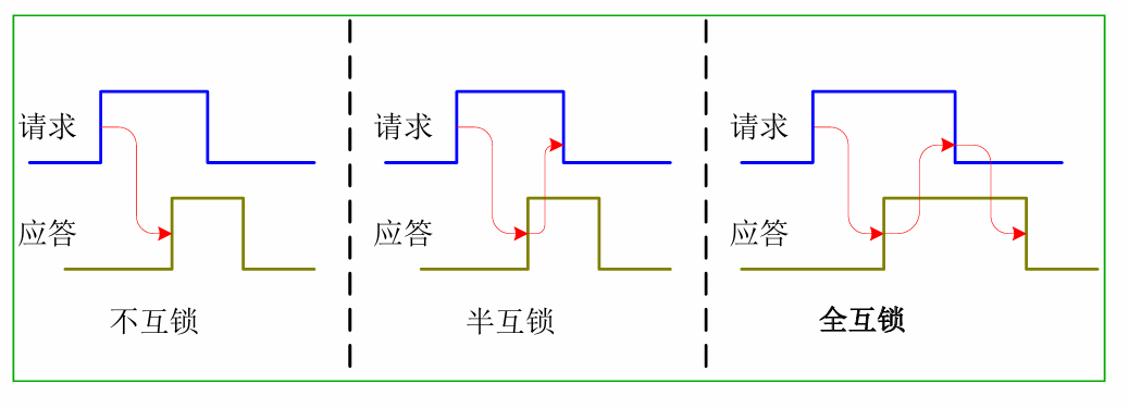 - 异步通信控制方式:不需要统一的公共时钟信号,没有固定的总线周期。采用请求/应答方式完成数据传输。有全互锁、半互锁和不互锁三种时序。