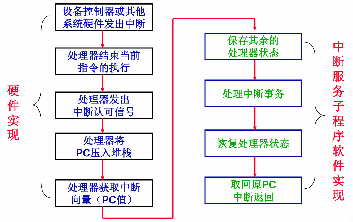 机器出现紧急事务,CPU不得不停下当前正在执行的程序,转去处理紧急事务,事务处理完后,再继续执行被中断的程序。