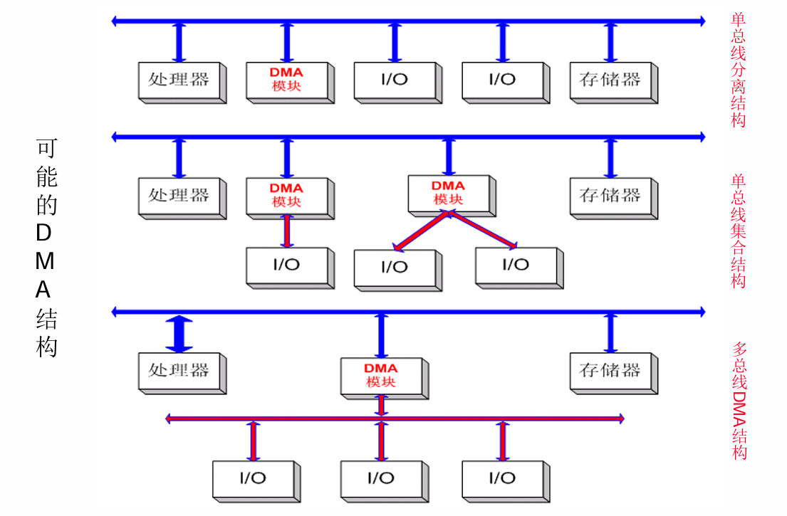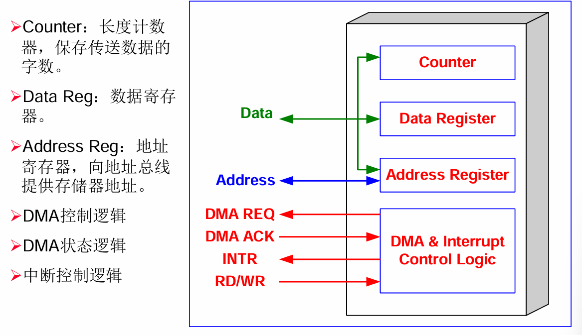 - CPU不再介入具体的I/O操作,由DMA控制器来负责提供存储器地址信号、读写控制信号等。