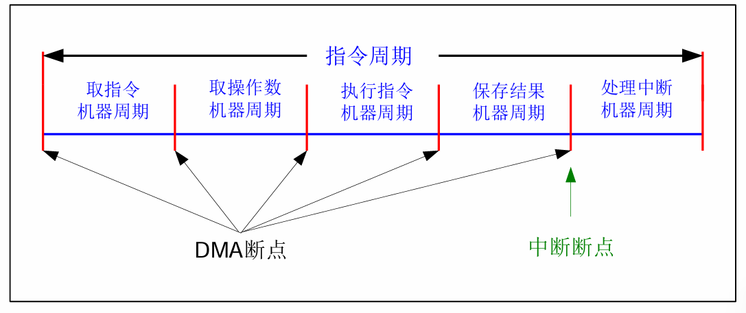 DMA 可在指令周期内的任一存取周期结束时响应;不中断现行程序,无须保护现场;依靠硬件传输数据,适于传送大批数据。