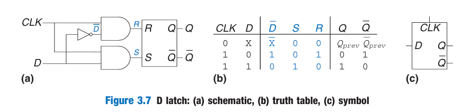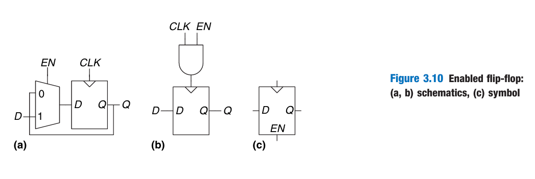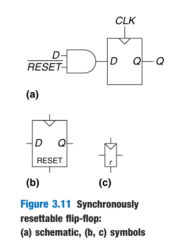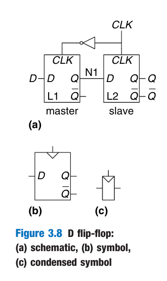 - 时序规范:传播延迟(tpcq)、最小延迟(tccq)(这两个从时钟沿开始计时,是触发器的传播延迟与最小延迟)、孔径时间(时钟上升沿直到输出改变的时间以及建立时间tsetup、保持时间thold)→ 输入必须相对于时钟上升沿稳定。