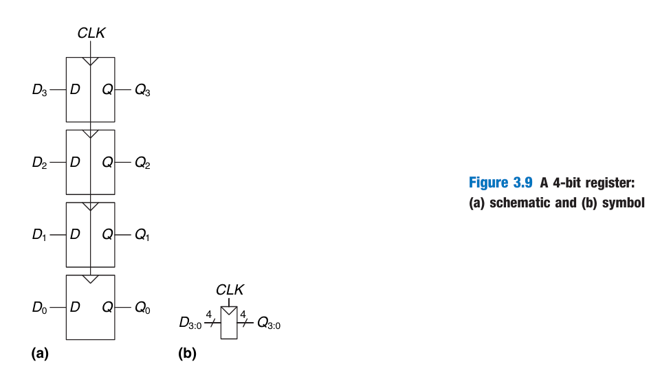 - 组成:一个 N 位寄存器由共享一个公共 CLK 输入的 N 个触发器组成(寄存器所有位同时被更新)