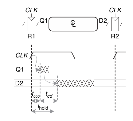 - 可靠触发器满足thold ⇐ tccq,因此背靠背连结组成寄存器的时候不会导致问题。事实上,触发器经常被设计成thold = 0。但如果保持时间较长且当前不满足,可以尝试增加缓冲器。
