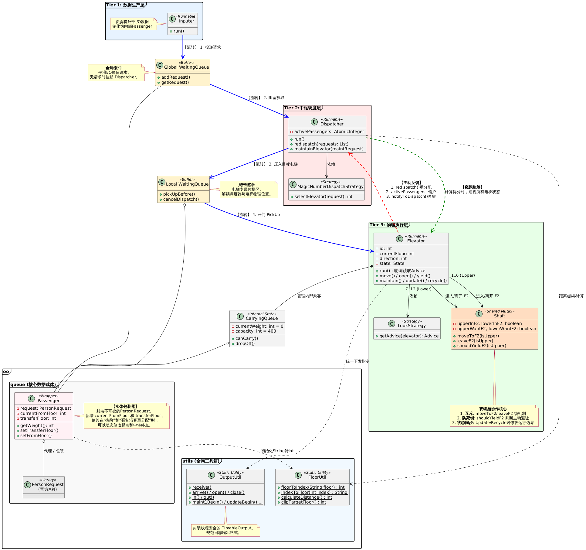 queue: 关于容器逻辑的包, 其内为对PersonRequest的包装, 以及承载Request的容器类CarryingQueue与WaitingQueue.runnable: 关于线程对象逻辑的包, 包括Inputer,Dispatcher和Elevator三个Runnable对象和其相关逻辑.strategy: 关于具体运行策略的逻辑的包, 包括dispatcher包, 负责调度逻辑; 以及elevator包, 负责运行逻辑.utils: 盛放工具类的包, 包括对输出逻辑进行封装的OutputUtil和对楼层运算逻辑封装的FloorUtil.