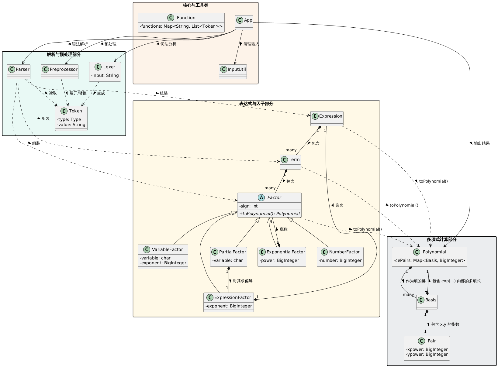 cn.edu.buaa.oo: 总包, 下有主类App, 与各个功能部件的包component.component:analytic: 关于多项式的数据与逻辑封装的包.factor: 关于各类因子的数据与逻辑封装的包.function: 关于函数的读取与存储的包.parser: 关于输入多项式的读取, 解析处理的包.utils: 静态工具类包.Expression,Term: 两个独立的类, 是题目表达式和项层级的数据与逻辑封装.