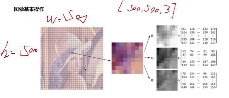 RGB 三通道,分别代表三个颜色上的亮度,可以用矩阵表示。 [500, 500, 3],三通道, 500 * 500 个像素。